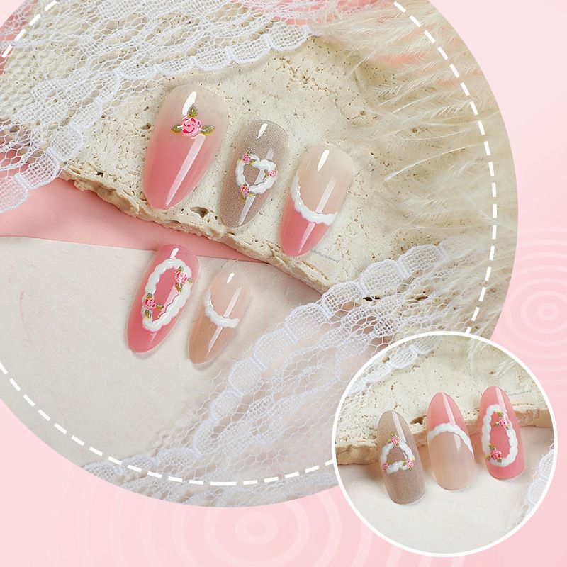 Niche floral romantic pink sophisticated ins-style almond-shaped millennial hot girl summer cute nail art.