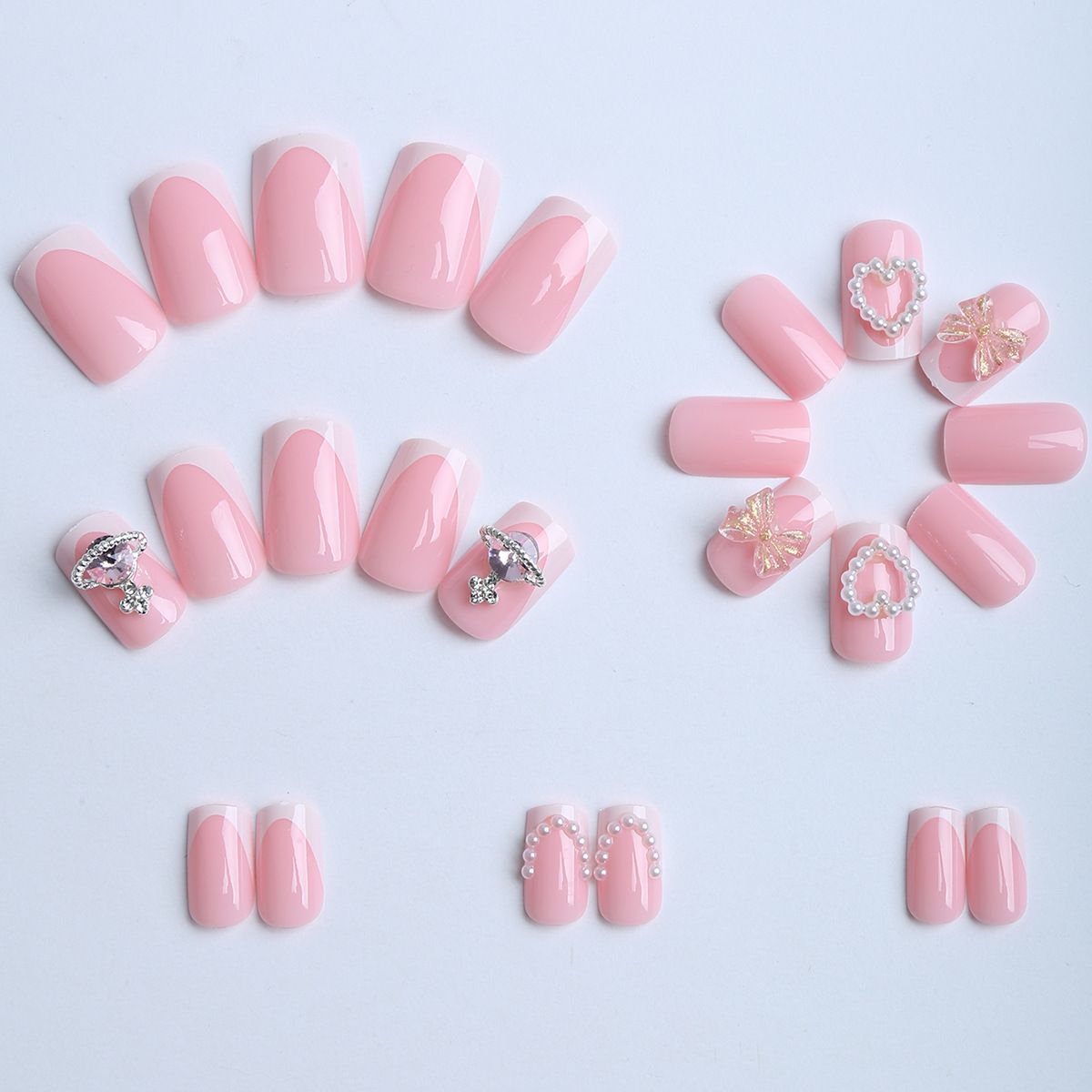 Short, square-shaped, pink French manicure with removable nail tips