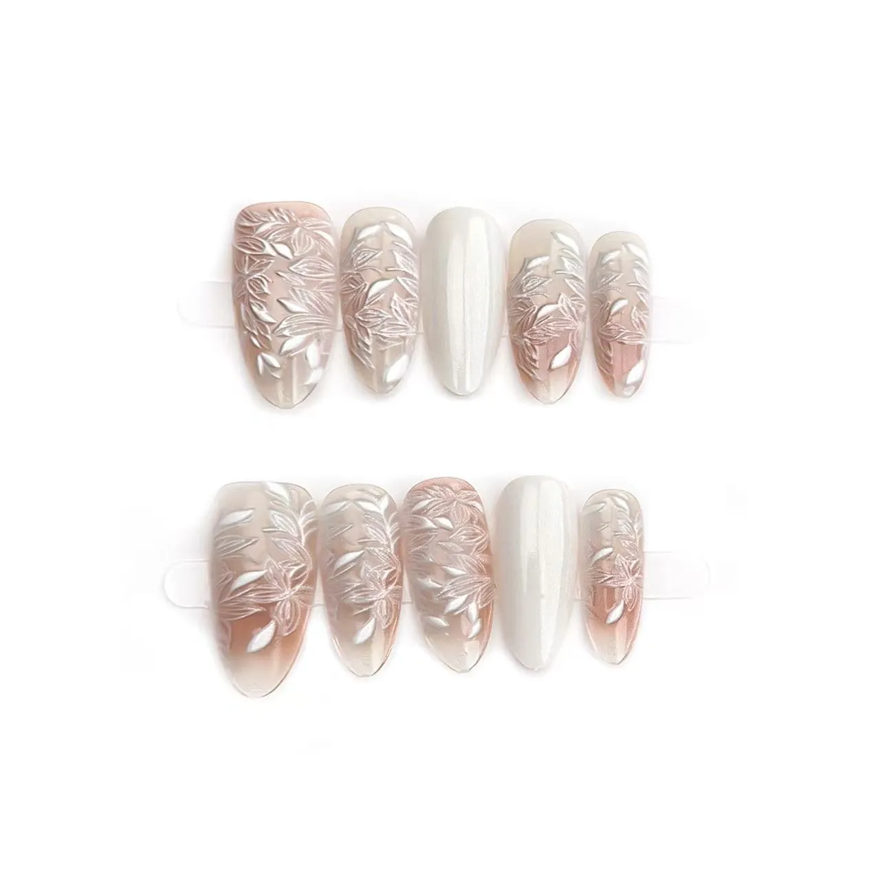 Elevate your manicure with these elegant leaf - engraved gradient press - on nails. Featuring a soft neutral - tone gradient from beige to white, paired with delicate leaf patterns, they bring a minimalist yet sophisticated touch to your look.