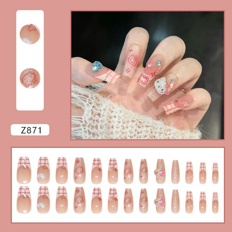 False nails, almond nail art, cute nail stickers, cat-themed sweet medium-length nail tips with rhinestones