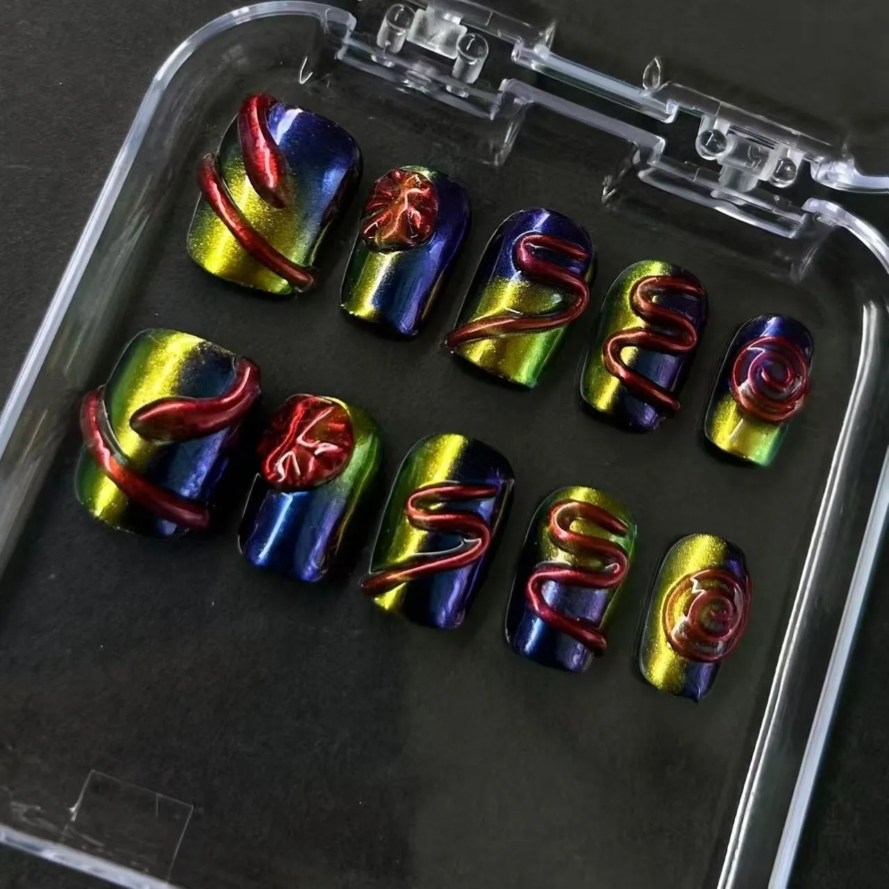 Dive into a world of bold style with these color - shifting 3D snake accent press - on nails! The iridescent base, shifting between blue, green, and purple, paired with striking 3D red snake designs, creates a gothic - inspired, one - of - a - kind nail art.