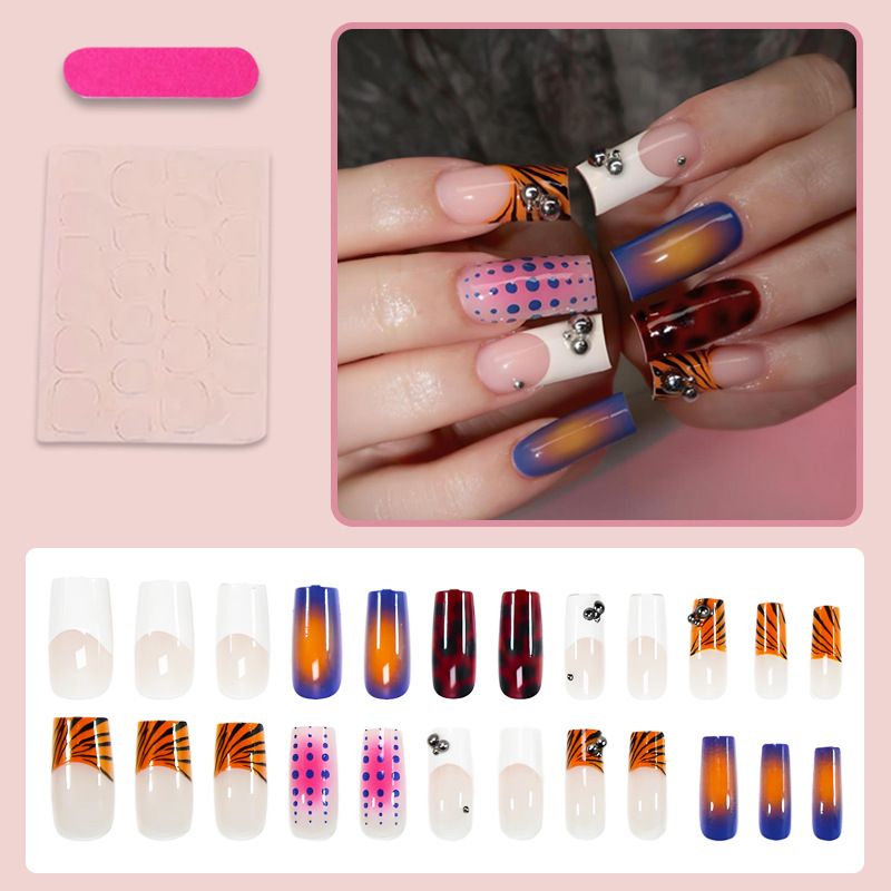 Design Style: Centered on "diverse mix-and-match," this design blends the playfulness of pink polka dots, the wildness of tiger stripes, the vibrancy of blue-orange gradients, the retro feel of leopard print, and the coolness of metal studs, breaking style boundaries to create a unique and artistic nail art.