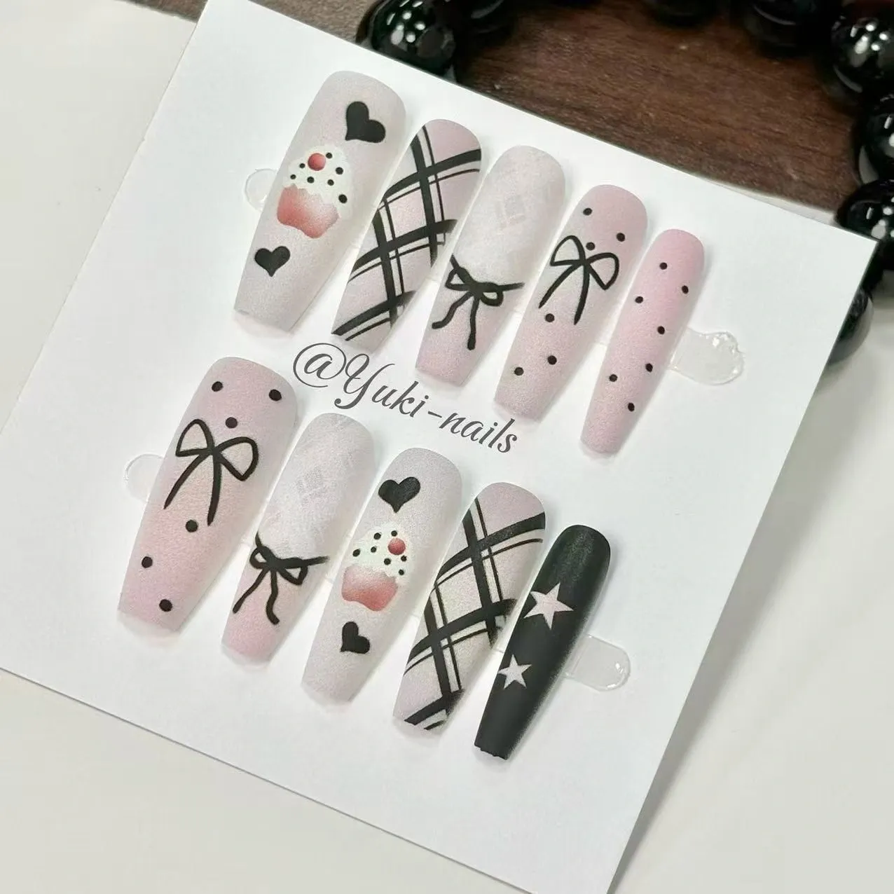 Transform your manicure instantly with these matte pink black bow press - on nails! Featuring a kawaii cupcake pattern and stylish black bows, these long fake nails bring a trendy and cute vibe to your look.