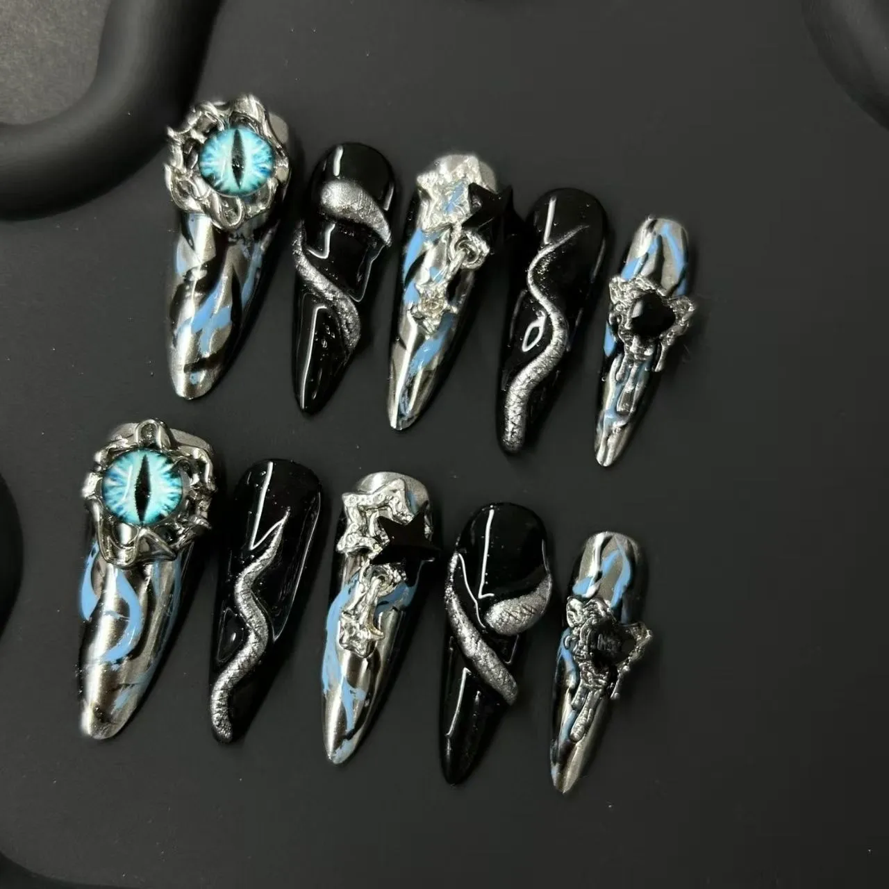 Step into the world of edgy fashion with these Gothic - style long press - on nails! Adorned with 3D eye and snake accents, they bring a bold and unique touch to your manicure. The combination of black, silver, and blue creates a striking visual effect that’s perfect for those who love alternative nail art.