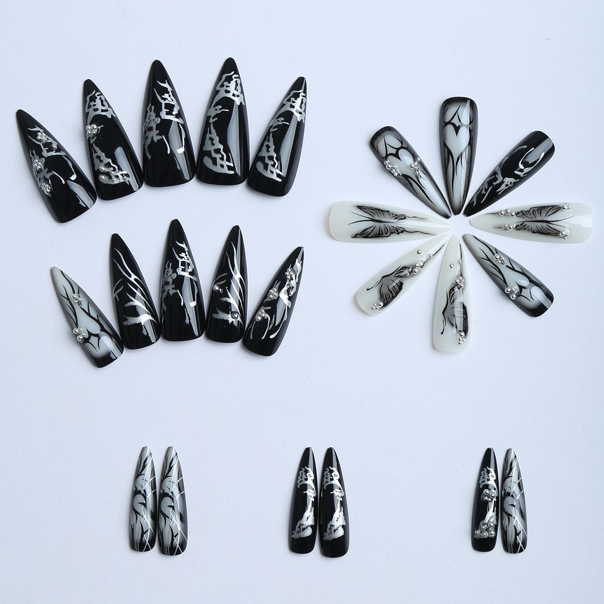 Dark style long almond-shaped wearable nails with silver steel bead butterfly prints and high-end false nail patches