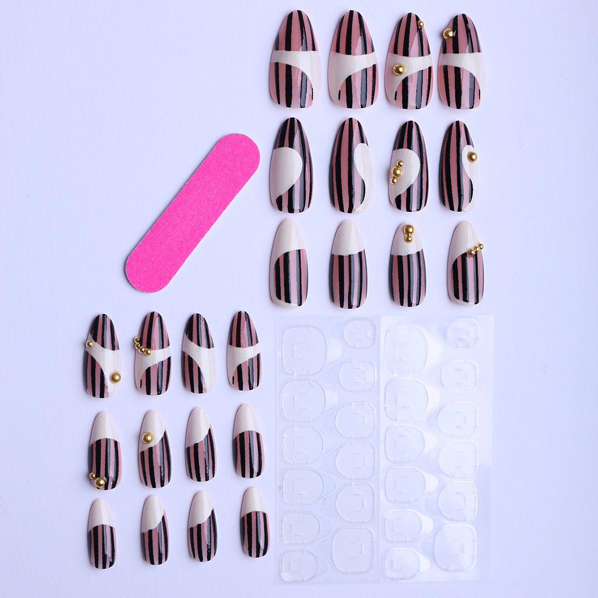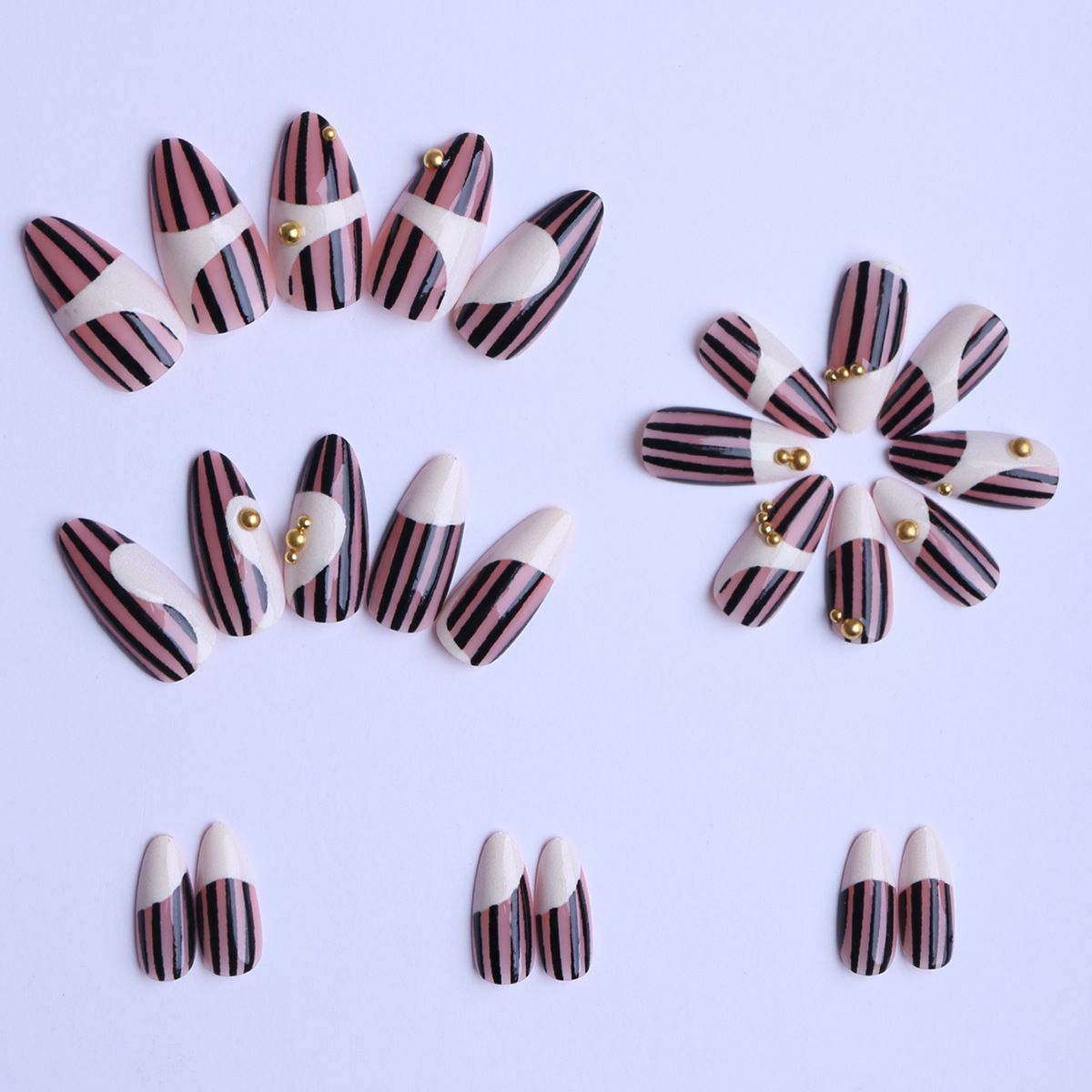 Continuing the elegant DNA of the French manicure, this manicure features a pure creamy white base, accented by delicate black stripes that outline the edges. The naturally flowing creamy white texture elevates the nail surface, transforming it from a flat, monotonous surface into a three-dimensional, layered effect. The flow pattern of each nail is meticulously designed, maintaining uniformity while also incorporating subtle variations, creating a unique, handcrafted look.