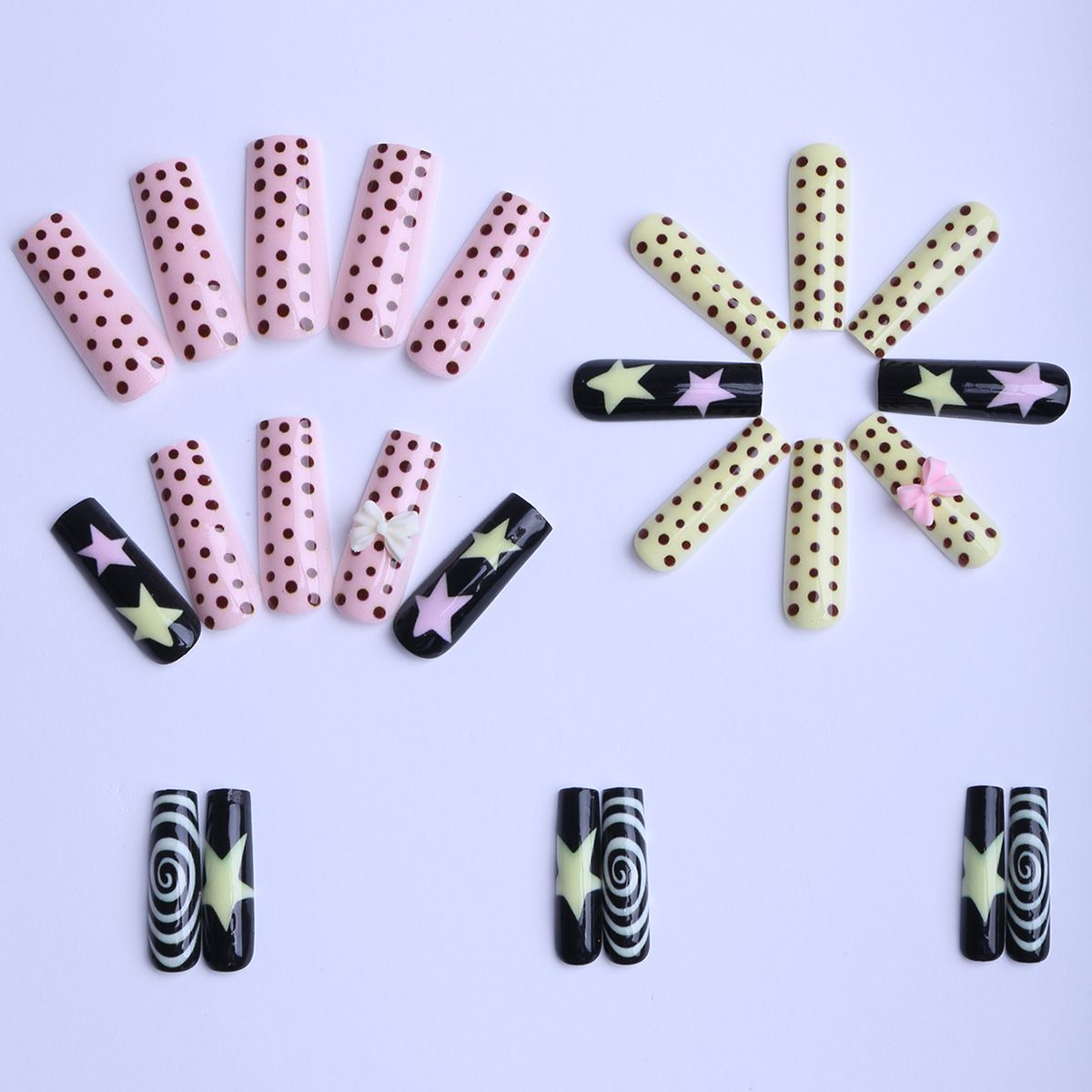 This nail shape breaks the monotony of a single design with a clever fusion of three trendy elements: sleek, adorable polka dots create a playful touch; delicate, three-dimensional stars punctuate the design, instantly elevating it to a striking, eye-catching finish; and a delicate spiral texture adds depth and texture to the nail. This fusion of elements creates a unique visual effect, easily switching between sweet, cool, cute, and retro styles to suit every occasion.